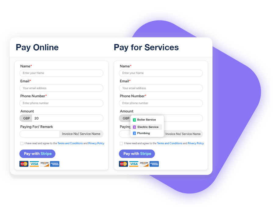 Accept online payments through Stripe, PayPal, or bank transfer.