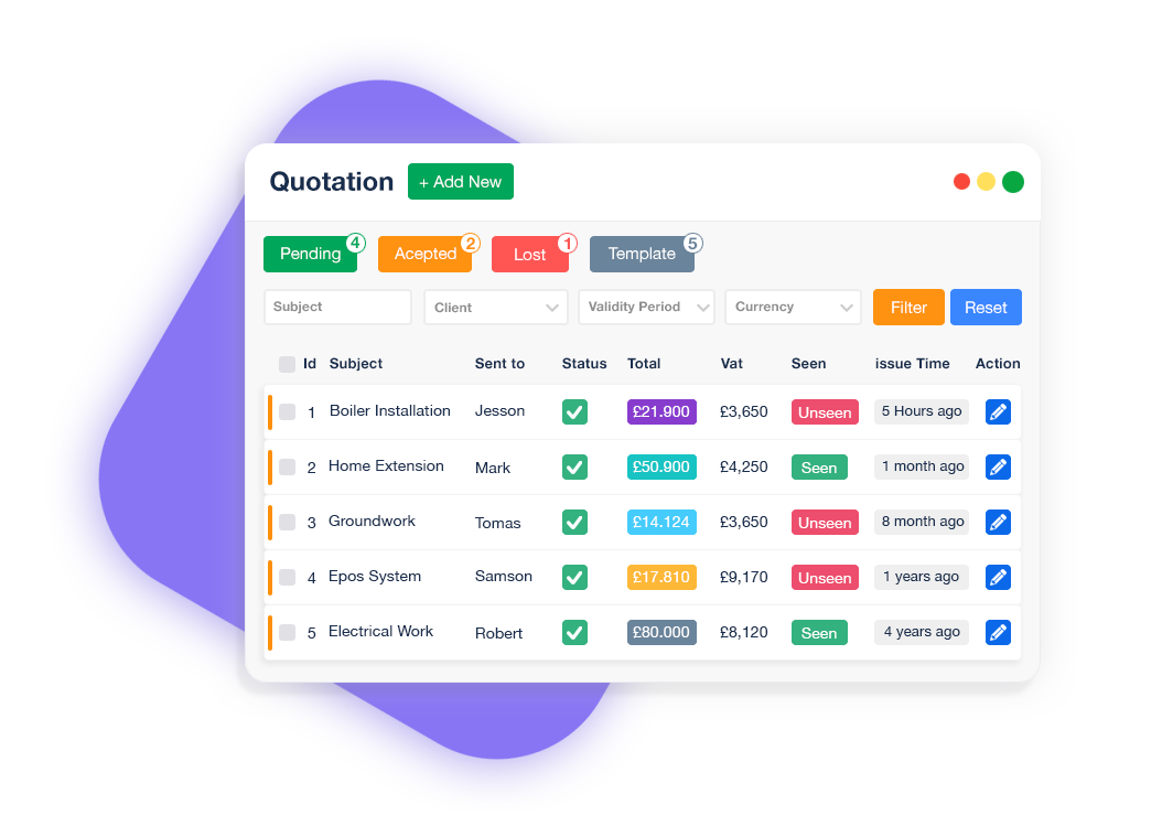 Speed up your workflow with reusable quotation templates or duplicate previous quotes in just a click.